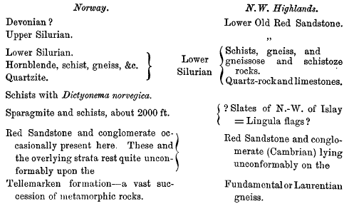 This parallelism may require considerable modification, but it is at least important at present in showing that, both in Norway and in Scotland, there is a bottom gneiss covered unconformably by strata containing fossils, and that these strata are again overlaid by an upper and later series of metamorphic rocks of Lower Silurian age.