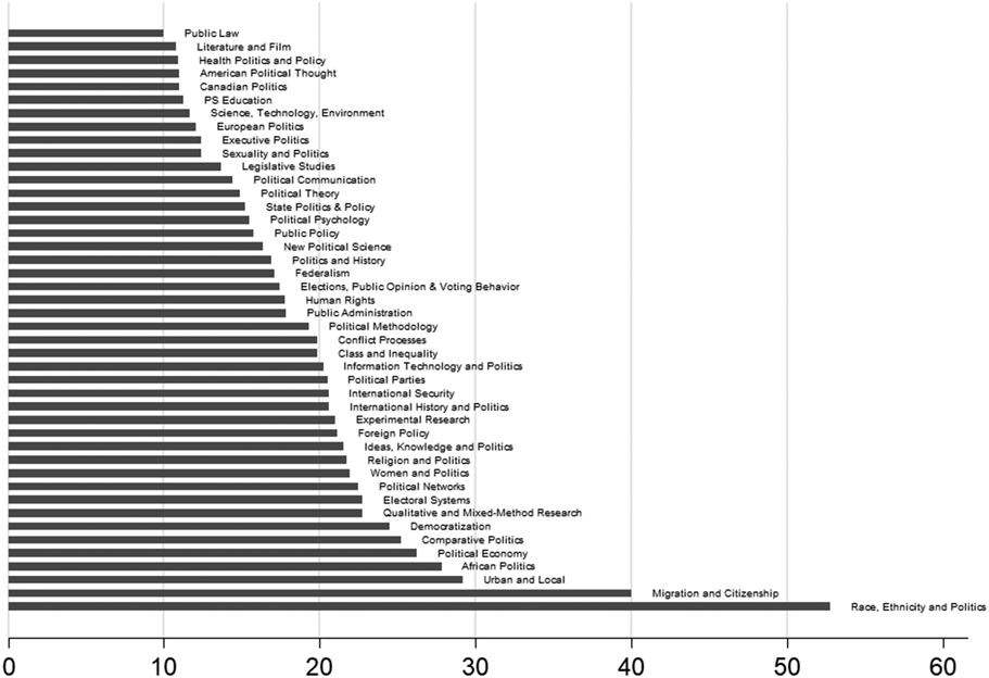 The average APSA subfield has approximately 38% female membership; however, there exists significant dispersion around that number (figure 2). Notable outliers include political methodology, with 19.92% female membership, and women and politics, with 91.67%. In fact, 37 subfields within political science fall below the 2013 average number of women in academia. Thus, gender disparity remains a systemic problem: 37 of 44 total (reported) subfields still fail to reach parity.