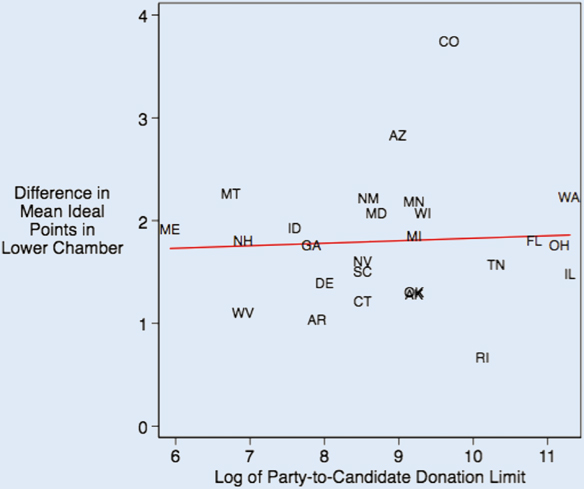 State limits on party-to-candidate donations vary wildly, from Maine’s very low $375 to Illinois’ $80,900 in 2016.Footnote 1 Twenty-two states have no limits at all. Figure 2 charts the relationship between a measure of state-legislative polarization—that is, the mean difference in ideal points in the lower chamber—against the party-to-candidate donation limits in states that have these limits. Because these figures are highly clustered toward the lower end, I logged this variable.