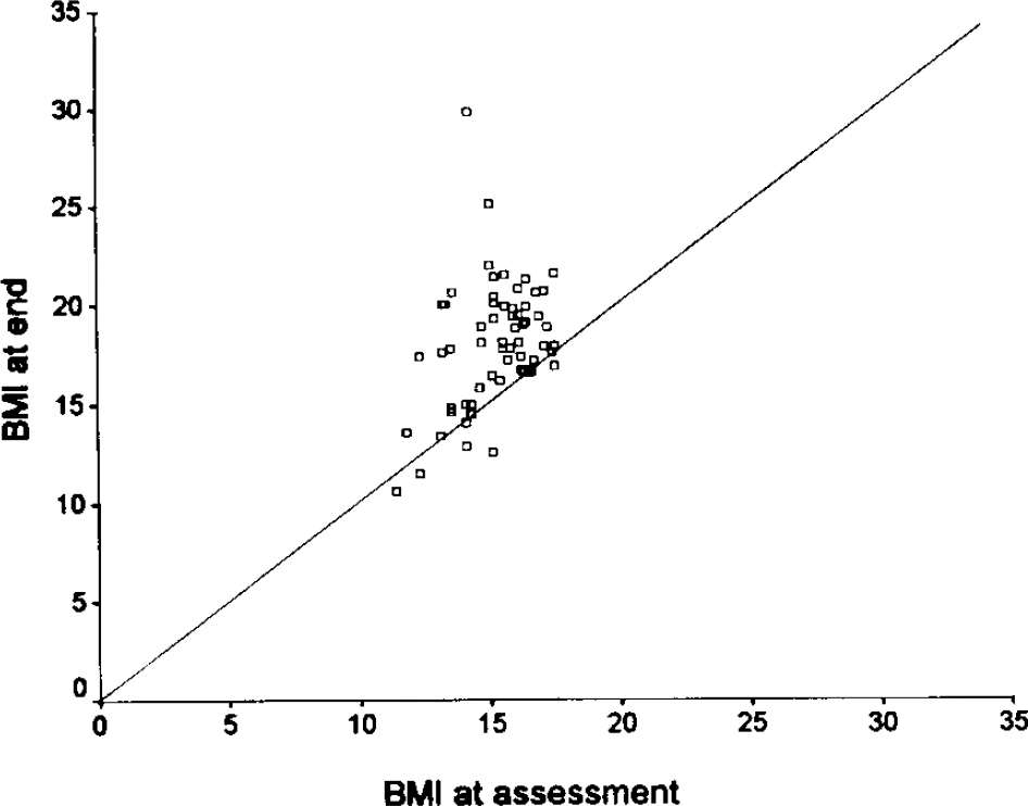 The index of outcome used in this study is even cruder. There is much more to recovery from anorexia nervosa than change in weight. However, weight change is necessary although not sufficient for recovery and it has the advantage of being easy to measure reliably. Most patients made progress while in touch with the service. The mean BMIs at last contact for both the ever admitted and never admitted groups were 18 kg/m2 and thus just about within the normal range. However, as the scatter plot demonstrates, the means hide considerable variation and some patients remained at low weight.