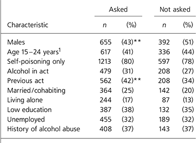 Over the 2-year period, there were 3031 episodes of hospital-treated DSH by 2287 individuals; 1047 men (46%) and 1240 women (54%). The 1943 patients (85%) whose previous history of DSH was known included 770 (40%) who had harmed themselves before and 1773 (60%) for whom this was their first recorded act of DSH. The prevalence of previous DSH was similar for men and women (41% and 38%, respectively). The opportunity to discuss life events as part of their assessment was given to two-thirds of all patients (n=1518). Table 1 compares those questioned about life events with those who were not questioned across a range of characteristics. There were fewer men among the patients asked about life events in their assessment (χ2=13.235, d.f.=1, P<0.001).