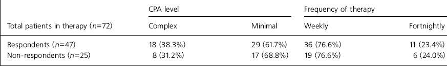 From the 72 patients in treatment we received 47 completed CORE questionnaires, a response rate of 65.3%. In terms of age and gender there were no differences between responders and non-responders. We were concerned to know whether the responders differed markedly in severity of risk or in frequency of therapy from non-responders. Of the respondents 29 patients (61.7%) had been placed on minimal CPA compared with 18 patients (38.3%) who had been placed on complex CPA. Of the non-respondents, 17 patients (68.8%) had been placed on minimal CPA and only eight (31.8%) had been placed on complex CPA. Patients are seen for psychotherapy in the department either weekly or fortnightly; of the respondents 26 (76.6%) were being seen weekly and 11 (23.4%) fortnightly, while of the non-responders 19 (76%) were being seen weekly and six (24%) fortnightly. These results are shown in Table 1.