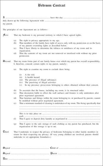 The ‘contract’ that follows was in lieu of that ruling. I have used this contract often as a means to get families debating the real issues behind the complaint of untidy bedrooms. I am sure the problem has been exacerbated by the great efforts some parents make to furnish children's bedrooms nowadays, and the cost of the clothes and CDs that cover the floor. Only the original barrister attempted to get the contract signed, most parents simply have fun with their teenagers trying to fit their complaints into the framework provided. Hopefully disequilibrium generates an opening for change.