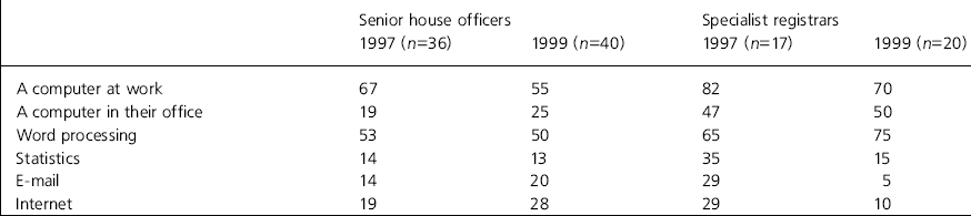 Psychiatrists will need to be able to use computers to take advantage of these developments and keep up with their patients. Williams & Curran (Reference Williams and Curran1998) identified poor access to computers as one reason why specialist registrars (SpRs) fail to complete research projects. We wished to examine the access that trainees have to computers and see whether they wanted more access and training. We repeated the survey after 2 years to see whether or not there had been any change.