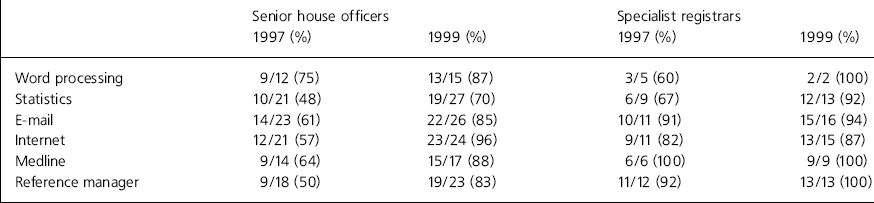 The poor access to computers and software is consistent with the findings of Williams & Curran (Reference Williams and Curran1998). In their survey of trainees in the Northern and Yorkshire regions in 1995 only 81% of SpRs had access to a computer. The similarity between their findings and the findings in 1997 and 1999 suggest that little has changed over this period. This is surprising considering the fall in price and increased use of computers. Although access did not improve, this survey suggests there was an increasing demand from trainees for access to these programs over this period. This is likely to reflect a growing realisation of the value of the tools and a higher expectation that clinicians should be familiar with the new technologies.