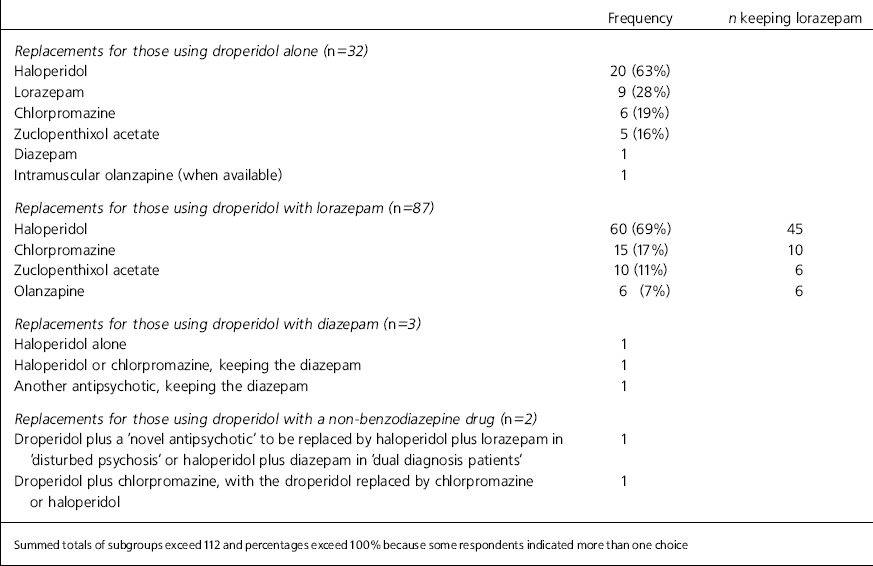 These are shown in Table 1. A minority used droperidol alone, most preferring to combine it with another drug, usually lorazepam. Haloperidol is the most popular replacement for droperidol. Lorazepam, chlorpromazine, zuclopenthixol acetate and olanzapine are less popular choices. More often than not, those who had prescribed droperidol with a benzodiazepine drug continued to prescribe a benzodiazepine drug with its replacement.