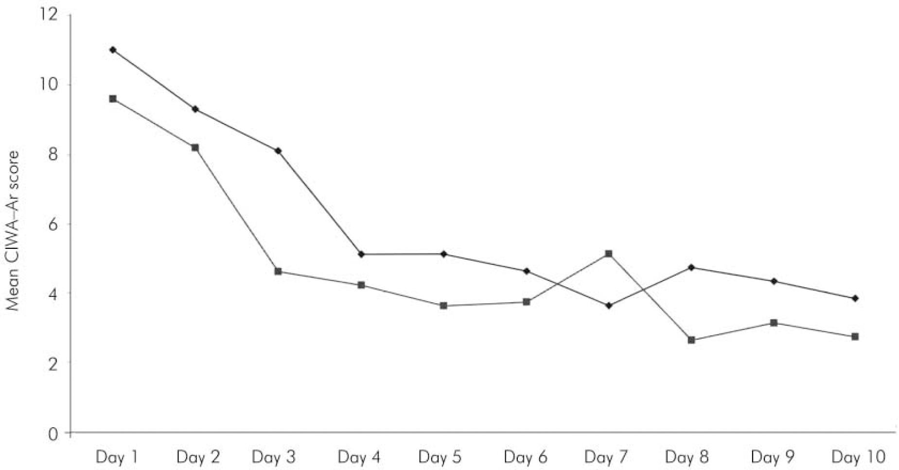 A further disadvantage of fixed dosage regimens is the length of time that they take. In cases in which the expected severity of alcohol withdrawal symptoms merits admission to hospital, it is not uncommon for the medication taper to take 5–10 days. An alternative is the use of a ‘ front-loading’ approach, whereby diazepam is administered at intervals of 1–2 hours until the patient is asymptomatic (Reference Heinala, Piepponen and HeikkinenHeinala et al, 1990). Such an approach is refined by using a symptom severity rating scale such as the Clinical Institute Withdrawal Assessment for Alcohol – Revised version (CIWA–Ar; Reference Sullivan, Sykora and SchnidermanSullivan et al, 1989) to assess the severity of withdrawal symptoms, the results of which dictate the amount of benzodiazepine prescribed. Such regimens may counter many of the problems with traditional fixed dosage techniques highlighted above, with the added bonus of standardised regular monitoring of patients. Furthermore, a number of studies suggest that front-loading regimens use less medication and have a shorter duration, as well as rein-forcing the fact that many cases of alcohol withdrawal can be managed without medication at all (Reference Sellers, Naranjo and HarrisonSellers et al, 1983; Reference Wartenberg, Nirenberg and LiepmanWartenberg et al, 1990; Reference Saitz, Mayo-Smith and RobertsSaitz et al, 1994; Reference Wasilewski, Matsumoto and KurWasilewski et al, 1996; Reference Silpakit, Silpakit and KumyanSilpakit et al, 1999; Reference Reoux and MillerReoux & Miller, 2000).