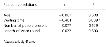 Our study showed that waiting time was the only significant variable affecting patient satisfaction with the ward round. Age, number of people present and length of ward round did not appear to be significant factors in affecting patient satisfaction. White & Karim Reference White and Karim4 also showed that having an exact appointment time and knowing the approximate time of when the patient would be seen were significant factors in patient satisfaction. However, they also found that the number of people present had an effect on patient satisfaction, whereas in our study this was not a significant factor. Interestingly, our total score correlated with the question that asked patients how they felt about the number of people present (r = 0.644, P < 0.01). This suggests that patient opinion regarding the number of people present is associated with patient satisfaction with the ward round, even though the actual number of people present is not. This may be due to the fact that the values used for the number of people present were patient estimates, rather than the actual size of the team.