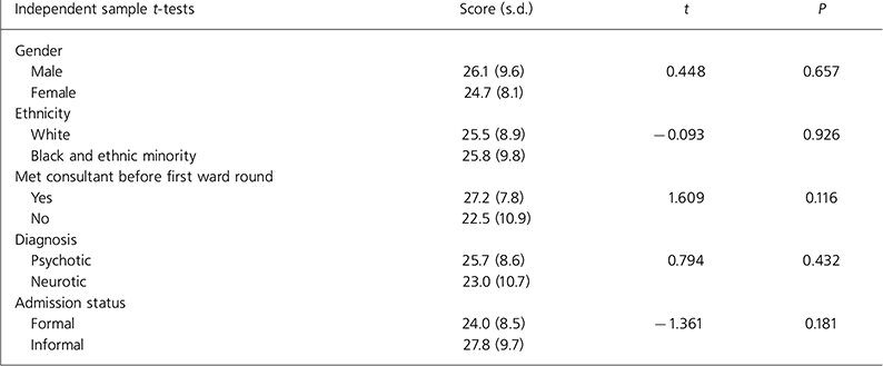 Of the 42 patients who took part in our study, 29 were men (69%) and 13 were women (31%). The mean age was 41.1 years (s.d. = 13.8, range 20–70). The age and ethnicity of the 42 participants were not significantly different from all hospital patients at the time of the study (P = 0.971 and P = 0.164 respectively), but the ratio of males to females was significantly different (P = 0.019). With regard to diagnosis, 29 patients (69%) were diagnosed with psychoses, 10 (24%) with neuroses and 3 (7%) had not been diagnosed. More than half of the participants (n = 24; 57%) were detained under the Mental Health Act 2007 and 18 (13%) were informal patients. The majority (n = 28; 67%) reported that they had met their consultant before the first ward round.
