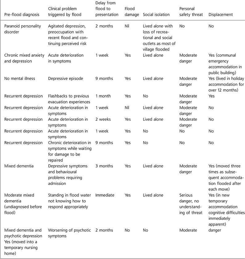 It became obvious for one person during a rescue and subsequent care in new accommodation that they had a previously undiagnosed moderated mixed dementia. They had had no noticeable problems until they were found standing waist deep in flood water, unable to react appropriately. From the records, and results of appropriate investigations, there was no evidence to suggest that the cognitive decline had been caused by hypothermia or near drowning. One person with dementia developed problems with behavioural difficulties and depression requiring admission. This followed three moves to escape flooding. A third person with dementia suffered worsening of psychotic symptoms in response to displacement and relative overcrowding in a temporary nursing home. Five people with depression, one person with mixed depression and anxiety, and one with paranoid personality disorder suffered from new depressive symptoms, with the flood being the only recognisable trigger. Only one person was diagnosed with depression without a previous psychiatric history - symptoms emerged after 9 months of living in temporary accommodation waiting for repairs to the flooded property.