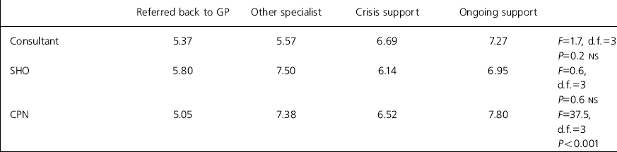 The consultants saw a significantly higher proportion of patients with a diagnosis of psychosis (10% compared to the overall average of 3%, χ2=11.9, d.f.=2, P=0.003). However, there were no other significant differences in the diagnoses of the patients seen by the consultants, SHOs or CPNs. The mean HoNOS—4 scores were highest for the patients seen by the consultant psychiatrists, 6.67 compared to 6.37 for the patients seen by the SHOs and 6.43 for the patients seen by the CPNs, but these differences were not statistically significant (F=0.34, d.f.=2, P=0.71, NS). The overall proportion of patients given ongoing support by one or more members of the CMHTs ranged from 35% for the patients seen by the consultant psychiatrists to 25% for the patients seen by the CPNs. Patients seen by SHOs were by far the most likely to be given short-term crisis support (see Table 1).