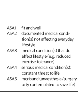 | ASA5 | moribund (anaesthesia/surgery only contemplated to save life) |
