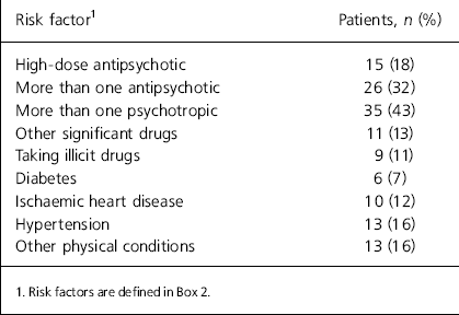 The survey of clinical practice showed that of 82 patients, 15 patients (18%) were receiving high-dose antipsychotics – above levels recommended in the British National Formulary (BNF) 14 – and 26 patients (32%) were receiving more than one antipsychotic: 24 were receiving two antipsychotics and 2 patients were taking three antipsychotics. A total of 29 patients (35%) were receiving two psychotropic drugs (non-antipsychotics) and 3 patients (4%) were receiving three drugs, 2 patients (2%) were receiving four drugs and 1 patient (1%) was receiving five psychotropic drugs. It was also found that 6 patients (7%) were receiving one other non-psychotropic drug which has been considered significant in the causation of torsade de pointes, 3 patients (4%) were receiving two such drugs, and 2 patients (2%) were receiving three such drugs. Nine patients (11%) also tested positive for illicit drugs.