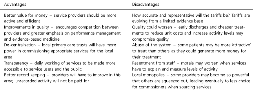 Payment by results was introduced by the Department of Health in a publication Reforming Financial Flows (2002). The government plans to implement it throughout the health service, including in mental health services, although specialist mental health services are likely to remain as they are, at least for the time being. Payment by results already applies to some acute hospital trusts (general hospitals). In mental health, it will replace the existing ‘block contract payment’ arrangements for services (Reference FairbairnFairbairn, 2007), possibly in 2009, although there are some concerns that the implementation will be difficult. What is clear however, is that this new system of paying for healthcare services and procedures will have a major influence on how mental health services are commissioned and financed (Reference FairbairnFairbairn, 2007).