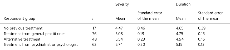 There was no significant difference in the self-reported duration of problem between any of the four groups: no therapy compared with those treated by their GP (unpaired t-test, t=0.27, d.f.=91, P=0.79), with those who had been treated by a psychiatrist or psychologist (unpaired t-test, t=1.59, d.f.=77, P=0.12) and with those who had used alternative therapies (unpaired t-test, t=0.80, d.f.=63, P=0.42).