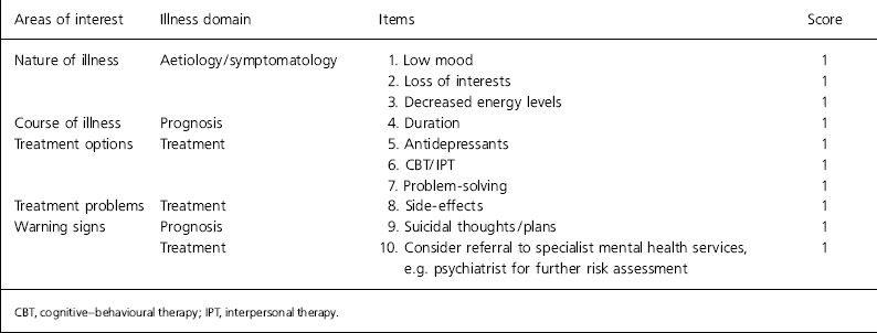 Two key documents were analysed for common factors suitable for converting into a simple measuring scale: the National Institute for Health and Clinical Excellence (NICE) draft document (NICE, 2001) and the World Health Organization Mental Health Checklist (WHO, 2001). From these, a ten-item scale was developed (Table 1). Each item attracts one mark and therefore all items are given equal weighting. The items address illness domains - aetiology, symptoms, treatment and prognosis. Summation of item marks gives a total score (C tot); the maximum possible score is 10 and the minimum is 0.