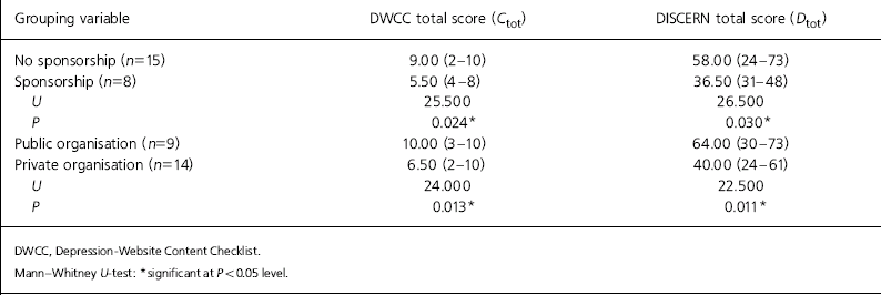 In addition to their individual quality, websites were compared according to two grouping variables, that is sponsored (yes) and non-sponsored (no). Evidence of financial support for the development and/or content of each of the websites was sought. A statement of such support on any of a website's pages resulted in allocation of that website to the ‘yes’ group, otherwise it was allocated to the ‘no’ group; the Mann-Whitney U-test (the non-parametric equivalent of a t-test) was used to compare the websites grouped in this way. They were also grouped according to organisation type - public organisations (governmental/professional bodies and charities) and private organisations (drug companies and individuals) - and analyses of their respective websites were performed.