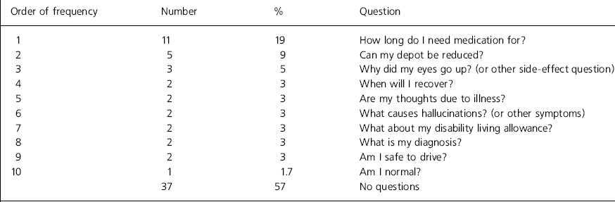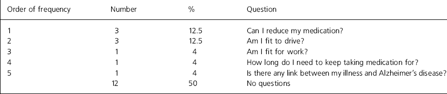 It could be that given more time for contemplation, more questions could be voiced. Some individuals may try to trivialise their concerns or not wish to bother their doctor with their anxieties. An opportunity to discuss their questions with a third party may be more helpful for this group. Conversely, a lack of questions may represent a form of denial or be a measure of lack of insight. Patients with bipolar illness asked the smallest variety of questions. None of these patients were new to the service, and may have had many opportunities to have their questions answered previously. A regular nurse-led lithium clinic is held for these patients, which has a particular focus on patient education. It could be that questions are saved for this clinic.