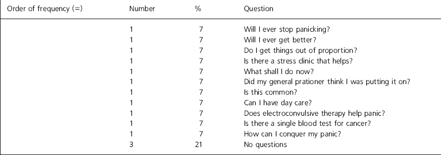 Fourteen patients (7%) with a diagnosis of anxiety or neurotic disorder were seen. There was no frequently mentioned theme, although all questions have an anxious quality. A desire for treatment is also discernible (Table 4). Only 3 of these patients (21%) stated that they had no questions to ask.