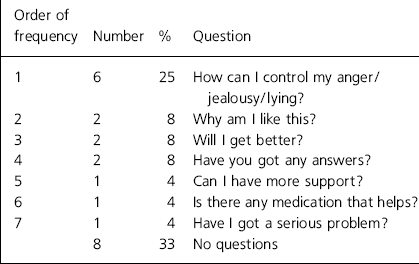Questions from 52 patients (26%) with unipolar depression were recorded (Table 2). Although most commonly patients wanted to know when they could stop their medication, a significant number asked for more treatment, or clarification of the benefits of treatment. The concept of ‘normality’ was a more common worry than for patients with schizophrenia. Of this group, 21 patients (40%) responded that they had no further questions when specifically asked.