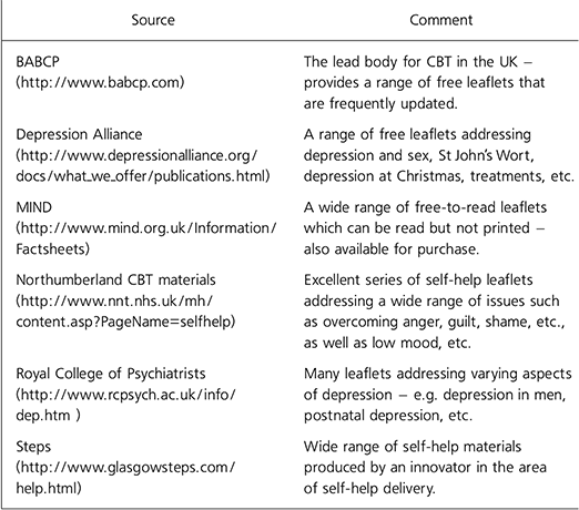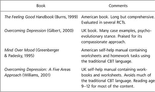 The majority of specialists who treat patients with depression using CBT utilise written self-help materials (Reference Keeley, Williams and ShapiroKeeley et al, 2002). These are used in a variety of settings to supplement individual or group therapy, for use by those on waiting lists and within book prescription schemes in primary care. It may be that practitioner support for the use of such books is essential and to date no controlled studies of book schemes have been published.