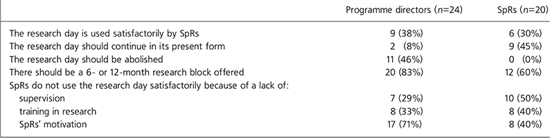 We surveyed a group of trainers and trainees; the response rate from programme directors (who arguably have the best overview of the use of the research day in each scheme) was high. It is not clear how representative the trainees' views were, but the questionnaire was sent to individuals that were likely to have talked to many of their colleagues about this issue. We did not question programme directors or trainees in the other subspecialities of psychiatry, and there is a possibility that their views might be very different. However, the authors believe this to be very unlikely.