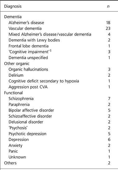 Of those sampled, 52 people had a diagnosis of dementia,7 had other organic diagnoses and 35 had functional diagnoses. There were 2 others, 1 with schizoid personality traits and 1 with a personality dysfunction (Table 1).