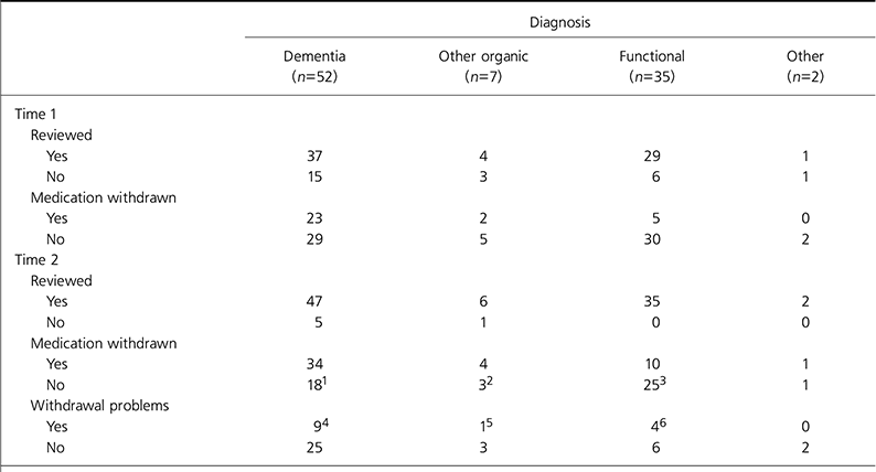 At Time 1, 71 of 96 patients (74%) had been reviewed; 41 of 43 (95%) of those current to psychiatric services had been reviewed, 23 of 40 discharged patients (58%) and 5 of 9 (56%) of those not seen by psychiatric services. By Time 2, 90 of 96 patients (94%) had had their medication reviewed. This included 7 who had since died and 3 who had since left the area.