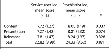 | Service user led, mean score (s.d.) | Psychiatrist led, mean score (s.d.) | P | |