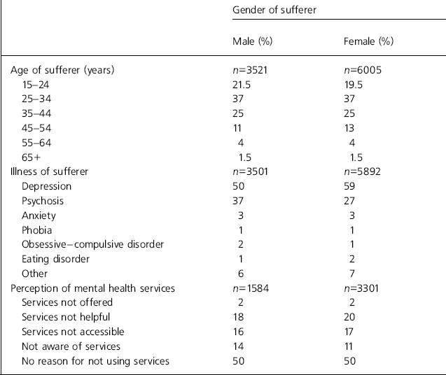 Table 1 Gender of sufferer by age, illness and perceptions of mental health services