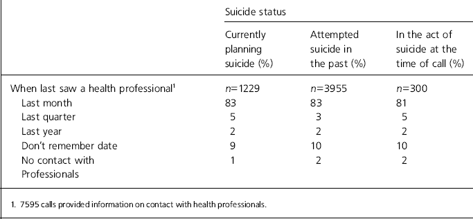 Half of the callers with suicidal ideation (n=5234) had attempted suicide in the past, almost a fifth (n=1619) were planning to commit suicide at the time of the call, and 5% (n=475) were in the act of suicide when calling the helpline. Most of those who were planning to commit suicide, or were in the act of committing suicide when they called the helpline, were in contact with services, that is, had seen a health professional (doctor or nurse) in the last month. This was also true of those who attempted suicide in the past (Table 3).