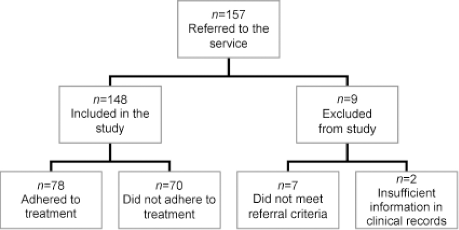 During the designated period, 157 individuals were referred to the service. Seven people referred to the service did not meet the referral criteria and two individuals had incomplete medical records. This left a sample size of 148 service users for data analysis.