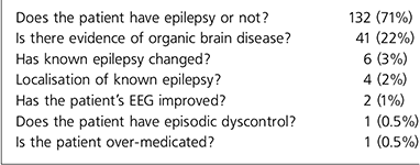 We carried out a simple retrospective analysis of 187 consecutive EEG requests to the Department of Clinical Neurophysiology at Royal Victoria Infirmary, from 22 general adult psychiatrists for a period of 12 months. Subjects were both in-patients and out-patients. All EEGs were reported by one of two consultants in clinical neurophysiology. Data were extracted from the EEG request form, which asked for the clinical reason for the test and the nature of any other medical or psychiatric diagnoses.