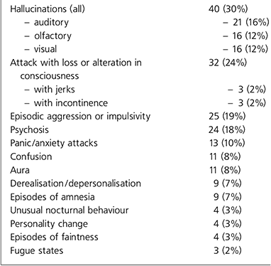 Table 2. 187 consecutive electroencephalogram referrals from psychiatry — clinical features on the request form for 133 patients in whom epilepsy was suspected (some requests had more than one feature)