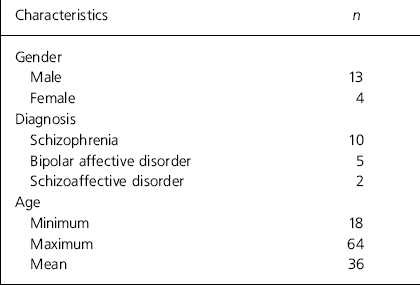 Initially, 22 in-patients consented to the video interview; 3 did not wish to view their video on discharge from hospital and so were withdrawn from the study. Of these, 2 felt it would be distressing to watch their video as they did not wish to be reminded of their illness now that they were feeling well; 1 did not respond to two invitations to view the video. A further 2 in-patients were withdrawn from the study by the researchers: 1 became increasingly agitated and paranoid during the initial interview and so the interview had to be terminated; the other in-patient revealed that he had not been open about his symptoms with his clinical team and since this raised doubts about his openness generally, he was withdrawn from the study. Thus, 17 patients continued in the study (Table 1).