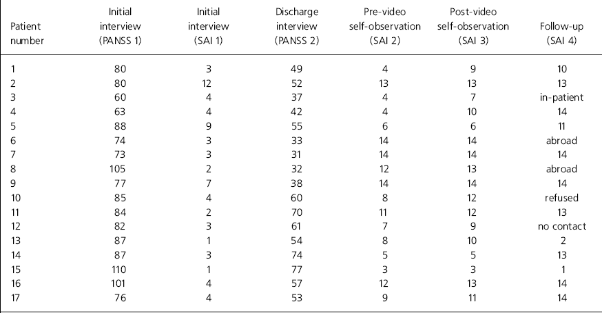 | Patient number | Initial interview (PANSS 1) | Initial interview (SAI 1) | Discharge interview (PANSS 2) | Pre-video self-observation (SAI 2) | Post-video self-observation (SAI 3) | Follow-up (SAI 4) |