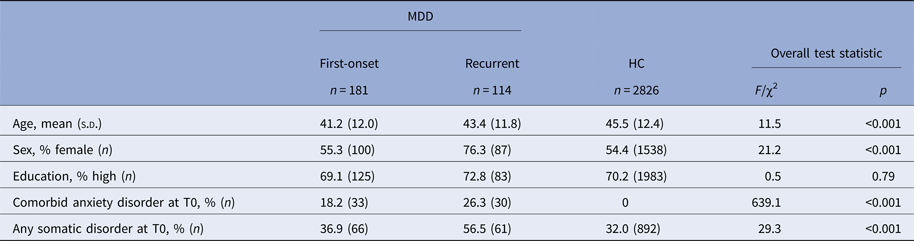Baseline demographic and clinical characteristics of the 181 first-onset and 114 recurrent MDD participants are presented in Table 1 and compared with those of the 2826 healthy individuals. Individuals in both MDD subgroups were on average younger and more often suffered from a comorbid anxiety disorder at baseline than healthy individuals. Individuals in the recurrent subgroup were also more often female and more often suffered from a somatic disorder at baseline than healthy individuals.