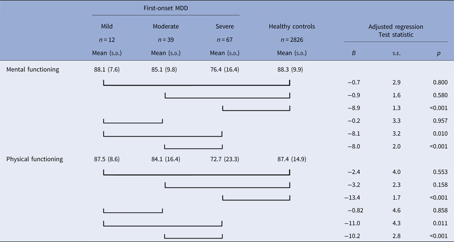 Table 3. Evaluating vulnerability effects in different severity groups; mental and physical functioning at T0 of participants who developed a first-onset 12-month major depressive disorder between T0 and T1 (mild, moderate, and severe MDD) and healthy controls