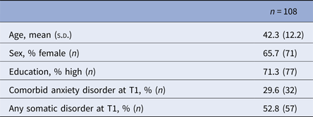 Covariates used in the analyses consisted of demographic and clinical variables, and were chosen based on their presumed association with both predictor and outcome. Demographic variables were assessed at baseline and included age, sex, and education. Education was defined as either low (primary, basic vocational, and low secondary education) or high (high secondary education, higher professional education, and university). Clinical variables included the presence of a comorbid anxiety disorder and the presence of a somatic disorder. The presence of a comorbid anxiety disorder (yes/no) was defined as any 12-month anxiety disorder according to the CIDI. This was assessed at all three waves. The presence of somatic disorders was also assessed at all three waves and ‘any somatic disorder’ was considered present if one or more of 17 chronic somatic disorders from a standard checklist was reported and had been treated or monitored by a medical doctor in the previous 12 months. These disorders included the most common chronic somatic disorders such as hypertension, chronic backache, rheumatoid disease, asthma, and diabetes. Comparisons between self-reports of chronic somatic disorders and medical records show moderate to good concordance (Baker et al. Reference Baker, Stabile and Deri2004; NCHS, 2004). Subthreshold residual symptoms were assessed at T2 with the K10, a self-report screening questionnaire with strong psychometric properties assessing psychological distress in the depression-anxiety spectrum in the past 4 weeks with 10 items on a five-point scale (Kessler et al. Reference Kessler, Andrews, Colpe, Hiripi, Mroczek and Normand2002; Donker et al. Reference Donker, Comijs, Cuijpers, Terluin, Nolen and Zitman2010). The K10 has proven to be both reliable and valid (Kessler et al. Reference Kessler, Andrews, Colpe, Hiripi, Mroczek and Normand2002; Donker et al. Reference Donker, Comijs, Cuijpers, Terluin, Nolen and Zitman2010).