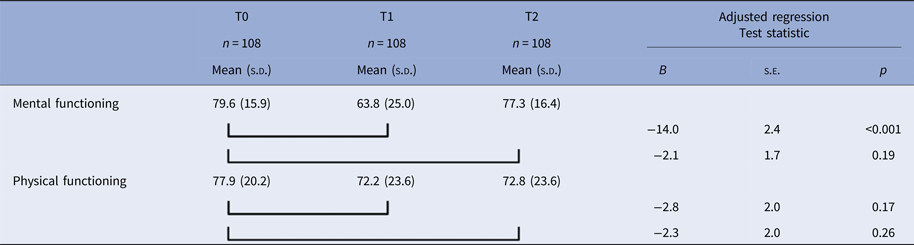 The characteristics of the 108 MDD participants who had developed a 12-month diagnosis of depression at T1 and were remitted at T2 are described in Table 4. Mean mental functioning in this group was lower at T1 than at T0, prior to the development of the depressive episode, and returned to premorbid levels following remission at T2 (see Table 5). The linear mixed models showed a state effect but no scar effect with regard to mental functioning, both in unadjusted (time T1, B = −15.1, s.e. 2.4, p < 0.001; time T2, B = −2.3, s.e. 1.8, p = 0.18) and adjusted analyses (Table 5). The random slope for time T2 was significant (s.d. = 17.3, 95% CI 13.7–21.7), which implies that there was large heterogeneity in the scarring effect. Physical functioning was higher at T0 than at T1 and T2. In the unadjusted model for physical functioning, both the state effect (time T1, B = −5.7, s.e. = 2.1, p = 0.006) and the scar effect (time T2, B = −5.1, s.e. = 2.1, p = 0.014) showed significance. In the adjusted analyses, neither the state nor the scar effect was significant (Table 5).