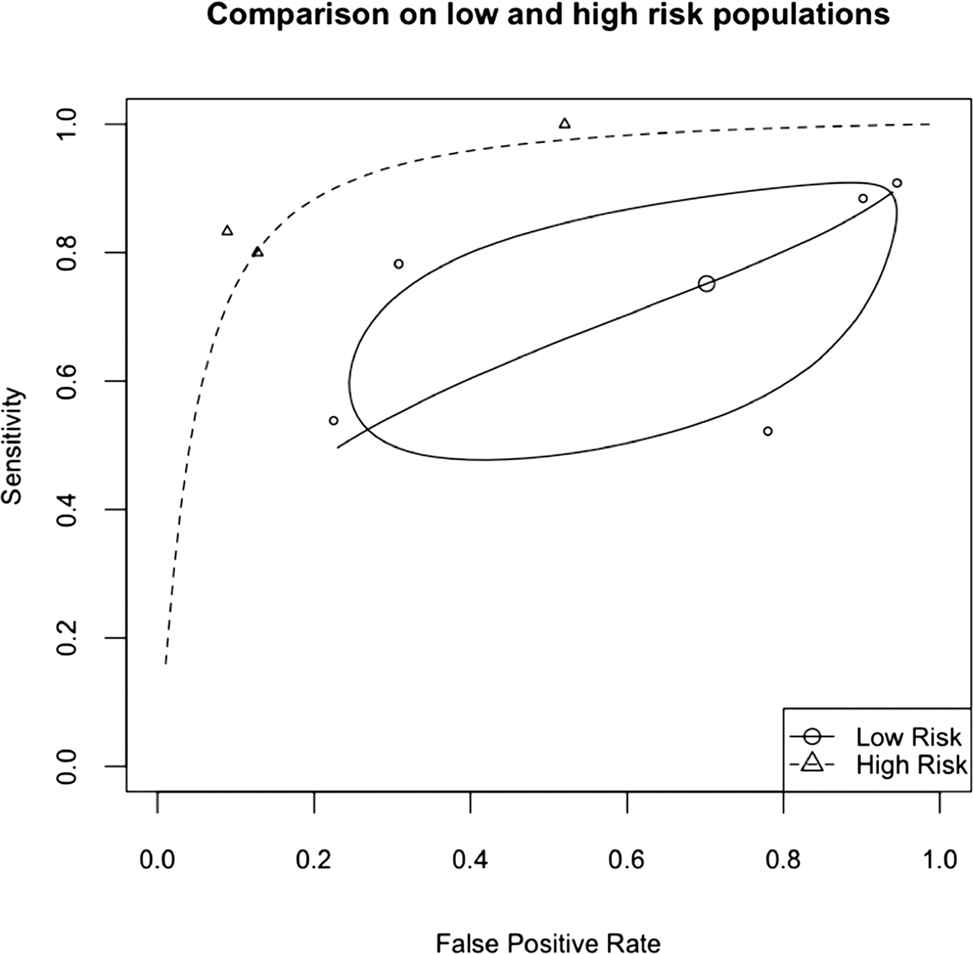 Fig. 1. SROC for low and high-risk populations, showing in the low-risk group the 95% CIs.