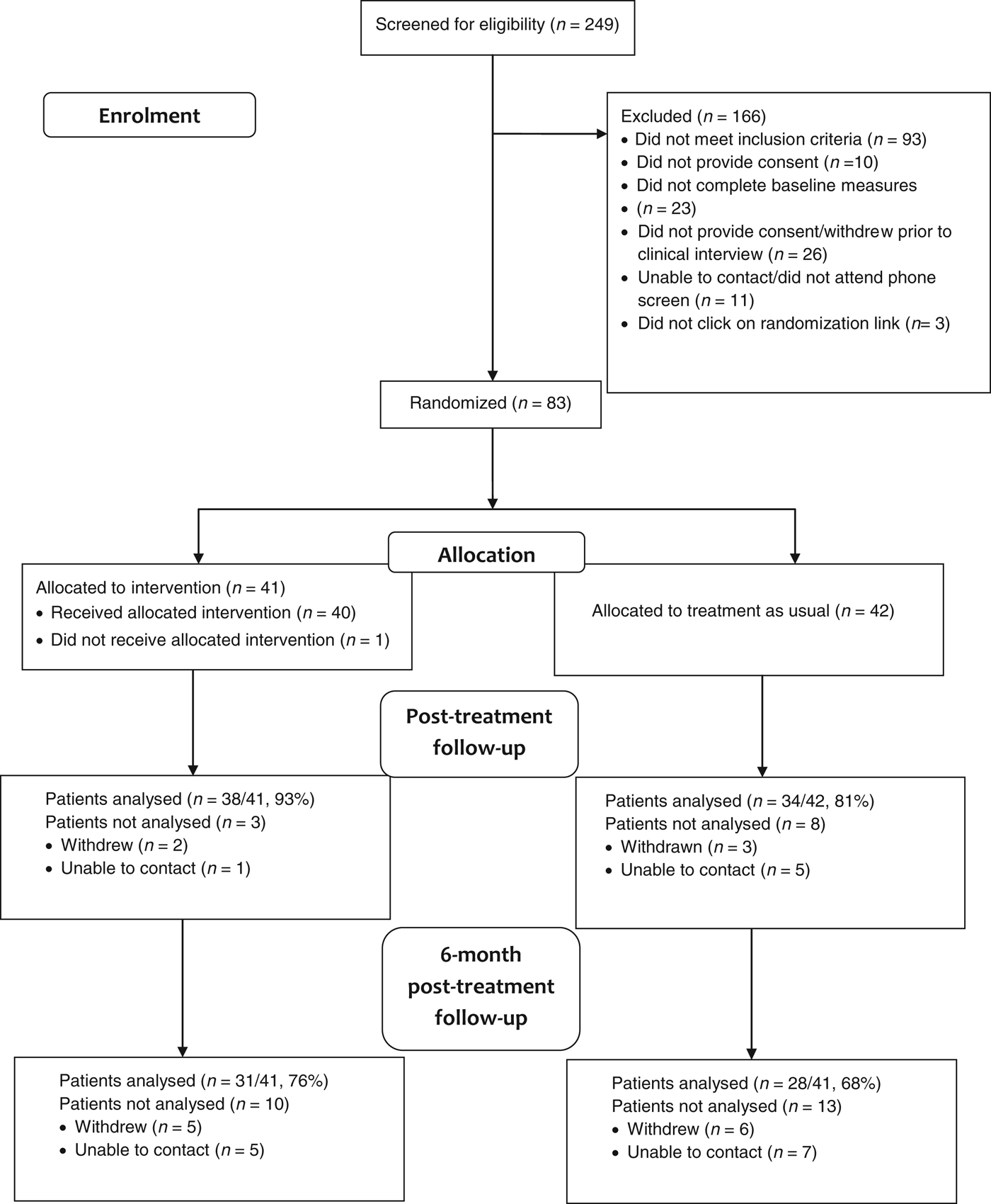 In accord with the UK Medical Research Council framework for complex interventions, we report the results of the subsequent phase II (Craig et al. Reference Craig, Dieppe, Macintyre, Michie, Nazareth and Petticrew2008) randomized controlled trial of the guided BA-based modular computerized treatment programme that we developed for postpartum depression (Netmums Helping With Depression; NetmumsHWD), compared with treatment-as-usual (TAU). The aims of the study were: (1) to establish recruitment and trial adherence rates; (2) to determine treatment adherence and predictors of modules and telephone sessions; (3) to assess the preliminary effectiveness of NetmumsHWD on depressive and anxious symptoms, work and social impairment, perceived support, and maternal self-reported bonding with her infant in order to help inform future sample size calculations; and (4) to gather data on health care utilization at baseline and at post-treatment in preparation for a health economic assessment.