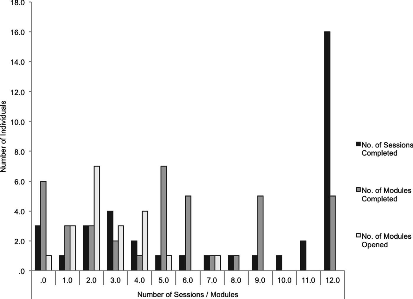 Fig. 2. Frequencies of the number of sessions/modules completed or opened.