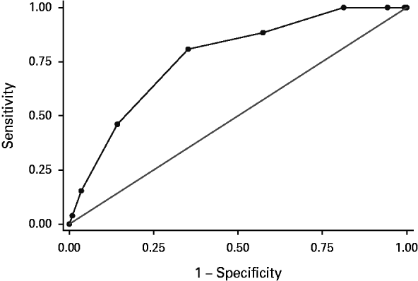 Fig. 1. Receiver operating characteristic (ROC) curve based on data from Snowden et al. (Reference Snowden, Gray, Taylor and MacCulloch2007) . Area under ROC curve=0.7688.