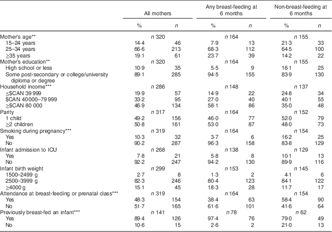 Characteristics of the study mothers are described in Table 1. Due to some missing responses, sample sizes are presented separately for each variable in the table. Two-thirds of participating mothers were between the ages of 25 and 34 years (66·6 %), the majority had at least some post-secondary education (89·1 %) and 46·9 % reported an annual household income level in excess of $CAN 80 000. Approximately half of the sample had attended a breast-feeding or prenatal class during pregnancy (48·3 %) and were first-time mothers (49·2 %). The rate of smoking during pregnancy in the current sample was 9·7 %. A total of 7·8 % of infants were reported by their mothers to be admitted to the intensive care unit, and the majority of infants in the sample (82·3 %) weighed between 2500 and 3999 g at birth. Just over half of mothers, 51·2 %, were providing at least some breast milk to their infant at 6 months, but only 6·8 % of mothers were exclusively breast-feeding at this time (Table 2). Mothers who were in the any breast-feeding group at 6 months were older, more educated, had a higher total household income, had lower smoking rates, and were more likely to have attended prenatal or breast-feeding classes than mothers who were not breast-feeding at 6 months.