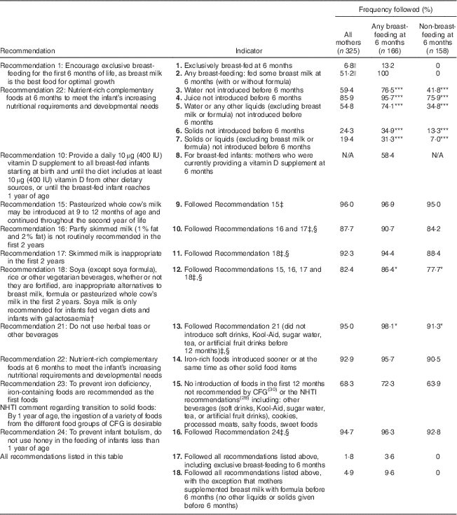 NHTI, Nutrition for Healthy Term Infants; CFG, Canada’s Food Guide; N/A, not applicable. Significant difference between groups: *P<0·05, ***P<0·001.