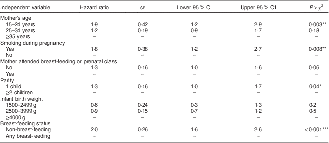 Table 4 presents the results of a Cox proportional hazards model examining the association between time to introduction of complementary foods and breast-feeding status, while controlling for infant birth weight and maternal age, parity, smoking and prenatal/breast-feeding class attendance. Results indicate that at any time point prior to 6 months for mothers who had not already introduced complementary foods to their infants, non-breast-feeding mothers were twice as likely as breast-feeding mothers to introduce complementary foods (hazard ratio=2·0, 95 % CI 1·6, 2·6, P<0·001). In addition, younger mothers (hazard ratio=1·9, 95 % CI 1·2, 2·9, P=0·003), first-time mothers (hazard ratio=1·3, 95 % CI 1·0, 1·7, P=0·04) and mothers who smoked (hazard ratio=1·8, 95 % CI 1·2, 2·7, P=0·008) introduced complementary foods earlier, regardless of breast-feeding status.
