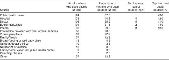 Table 5 Sources mothers used and ranked as most useful to obtain information on introducing complementary foods to their infant; Kingston, Frontenac, and Lennox & Addington (KFL&A) Infant Feeding Survey, Ontario, Canada, 2008