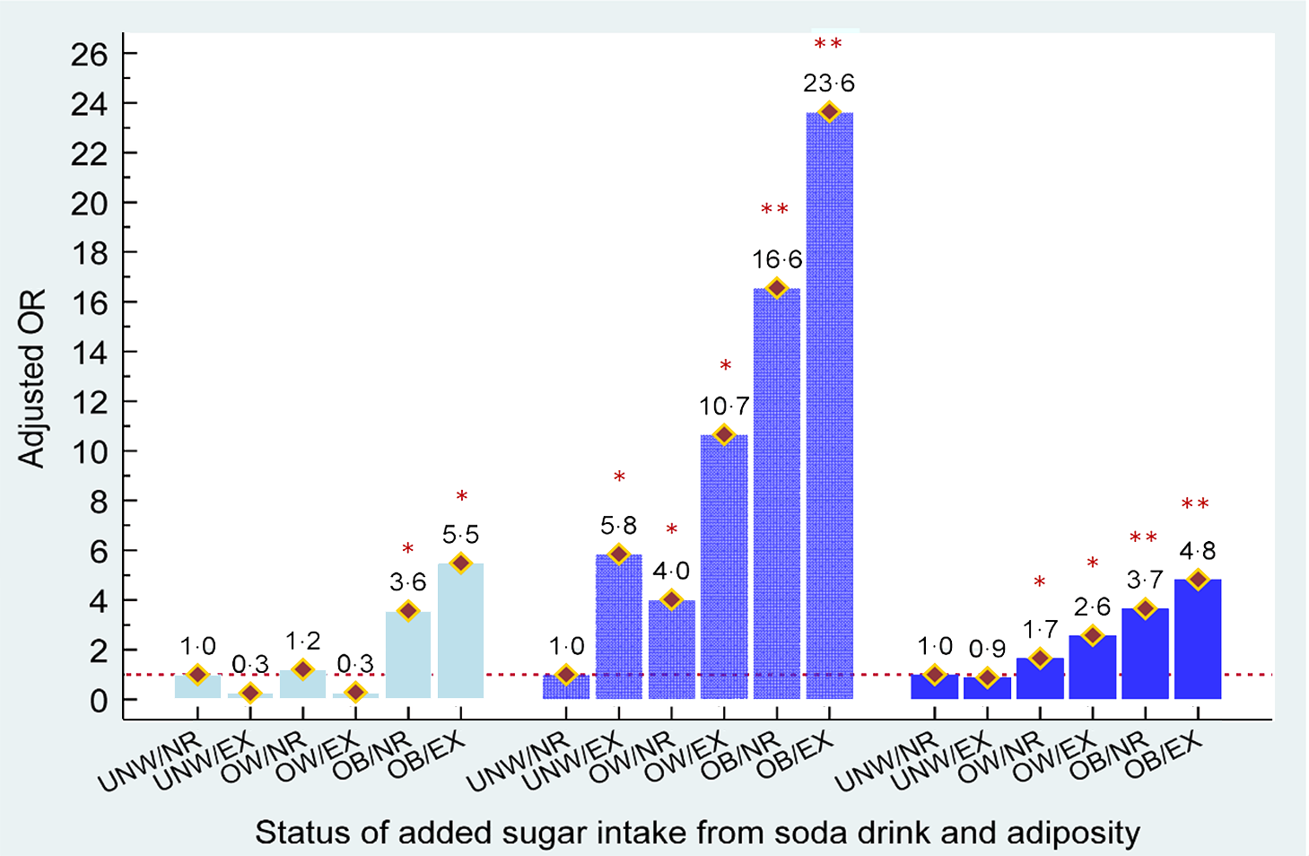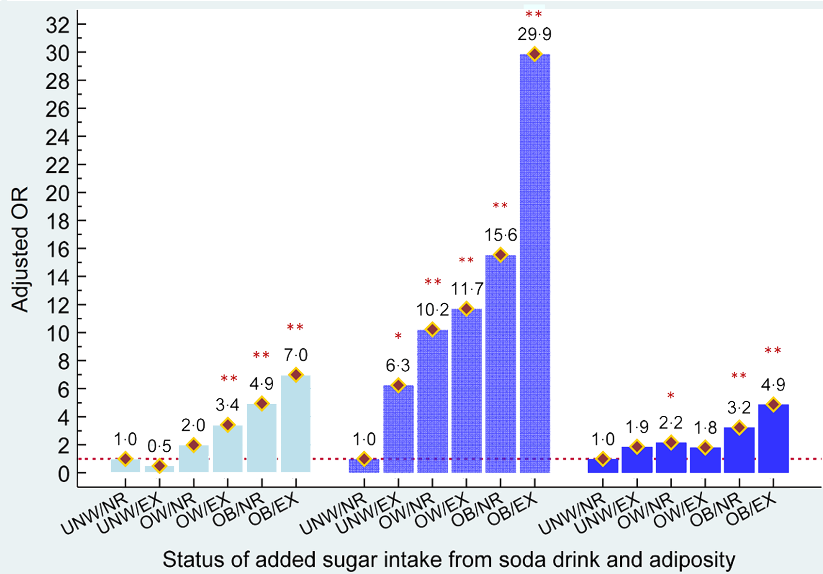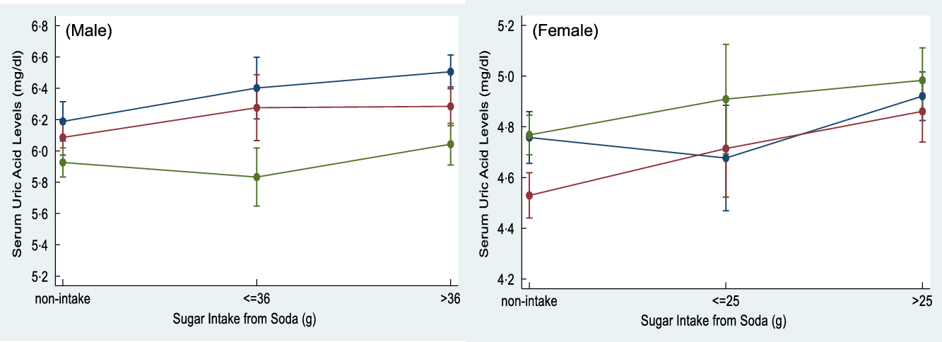 According to our findings, the association between amounts of added sugar intake from soda drinks and risk of having hyperuricaemia in age- and gender-specific US adults was observed after controlling for potential confounders and adiposity status. A dose–response gradient between added sugar intake from soda and hyperuricaemia only was detected in male adults. Furthermore, obese adults who consumed excessive amounts of added sugar from soda had the highest risk of having hyperuricaemia, when comparing under/normal-weight adults who consumed none/regular added sugar from soda in all age- and gender-stratified groups.