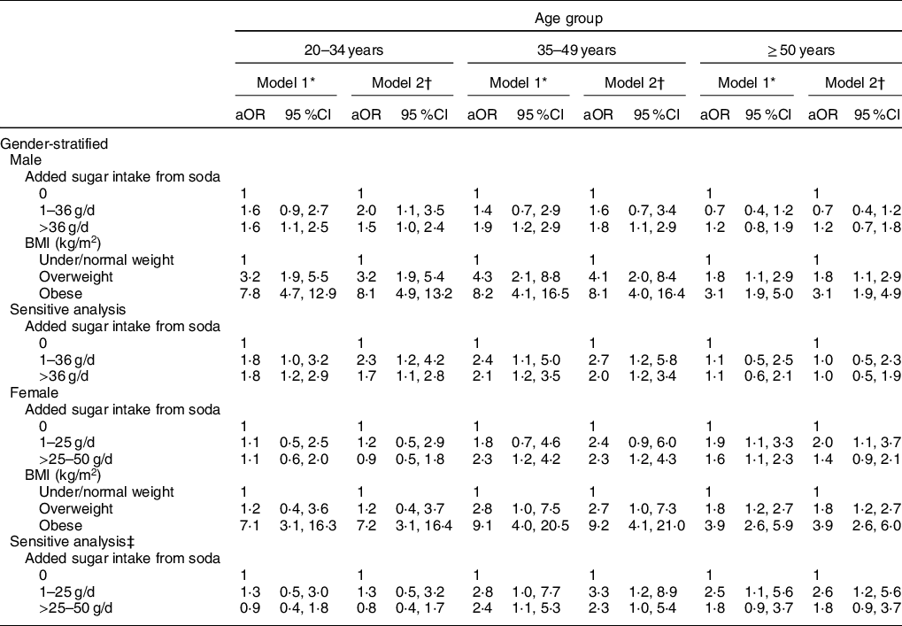 Table 4 presents the association between daily amounts of added sugar consumption from consuming soda and the risk of hyperuricaemia and/or being overweight/obesity status. When controlling for demographic and lifestyle factors, personal medical conditions, daily dietary intake and eGFR status, a 1·6- to 1·9-fold higher risk of having hyperuricaemia was found in males aged <50 years old who consumed excessive added sugar from soda (>36 g/d) (Model 1). After additionally controlling for BMI, young males (<35 years old) who consumed medium (1–36 g/d) and high (>36 g/d) added sugar from soda were estimated to have a 1·5- to 2·0-times increased risk of having hyperuricaemia when compared with non-soda drinkers. In middle age males (35–49 years old), excessive added sugar consumption from soda was still positively associated with the risk of hyperuricaemia development (aOR = 1·8, 95 % CI = 1·1, 2·9) (Model 2). We did not detect a significant risk of added sugar intake from soda on hyperuricaemia development in older males (≥50 years old). For males, overweight and obesity status were also observed to increase risk of having hyperuricaemia across all ages. Results were shown to be consistent through sensitivity analyses that used models which excluded subjects with hypertension or heart-related diseases.